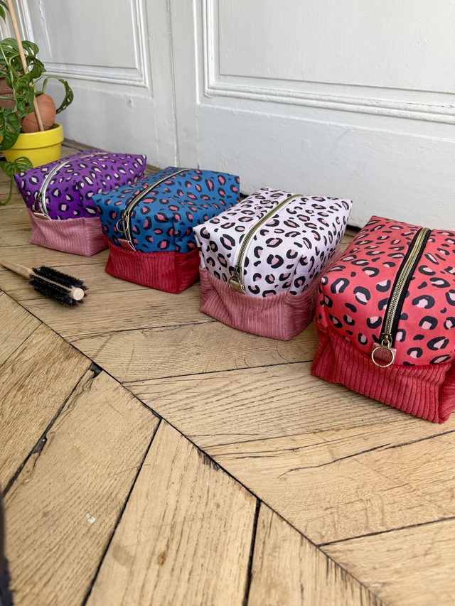 Trousse de toilette carré - tissu intérieur imperméable - LEOPARD velours pétrole + pétrole